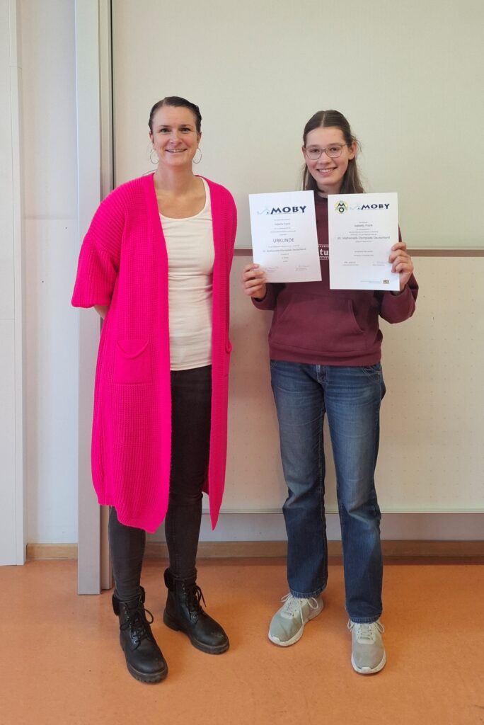 Dieses Jahr nahm auch Isabella Frank, eine Schülerin der Klasse 11a, teil und zeigte dabei ihr außergewöhnliches mathematisches Können. In der ersten Runde erreichte sie einen hervorragenden 2. Platz und qualifizierte sich damit souverän für die nächste Runde des Wettbewerbs. Obwohl sie hier nun ausschied, ist allein diese Qualifikation ein bemerkenswerter Erfolg und ein eindrucksvoller Beweis für ihr mathematisches Talent und ihr Engagement. Wir gratulieren sehr herzlich!